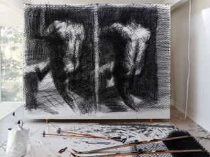 Beginning with customary drawing tools – a slate pencil on paper, the artists increasingly re-entrust the function of the pencil to the chain-link, combined with the black ties which transform into the strokes that form the image. Sometimes the intertwining makes them resemble a Rembrandt etching: the metal chain-link in the artists’ hands acquires a completely graphic nature. The gaps that reveal the bare foundation of the paper, may be especially dramatic – this effect was well-known to the Italians Lucio Fontana and Alberto Burri, who cut up and burnt canvases, giving their paintings a literally physical corporality. Unlike the masters of the “arte povera”, the multilayer “flesh” of the works of Gretsky and Kats looks less vulnerable, although the depicted figures are usually nude.